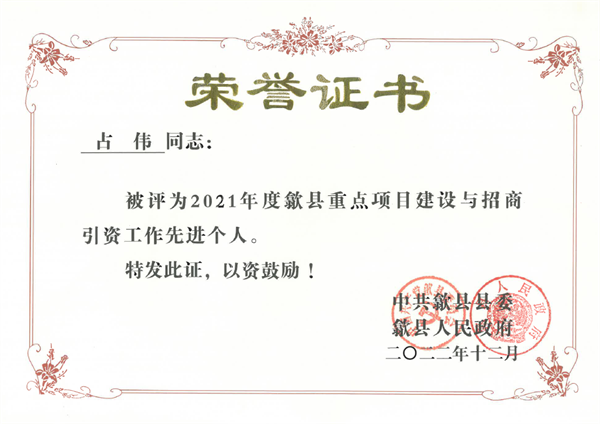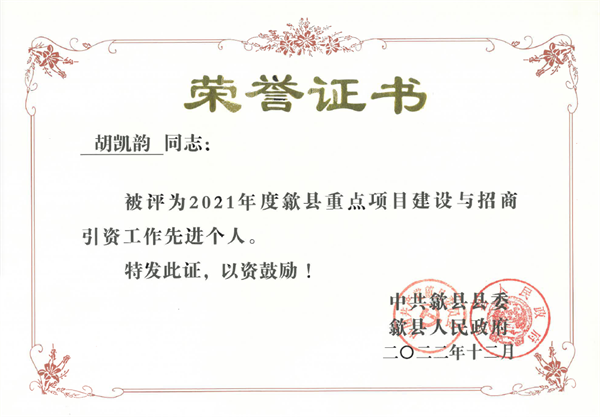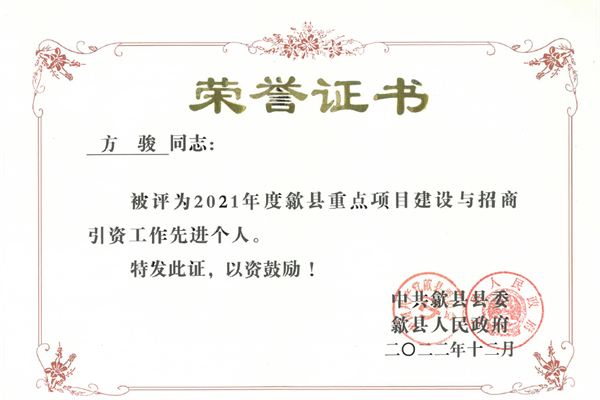 根据《中共歙县县委 歙县人民政府 关于2021年度歙县重点项目建设与招商引资工作先进集体和先进个人评选表彰结果的通报》(歙〔2022〕195号)文件通报,黄山徽投集团荣获2021年度歙县重点项目建设与招商引资工作先进集体和先进个人(4人)。