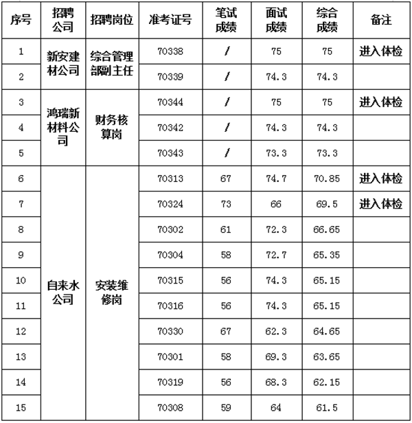 黄山徽投集团下属子公司招聘员工面试工作已于2020年3月29日结束,现将面试成绩及最终综合成绩公布如下:
